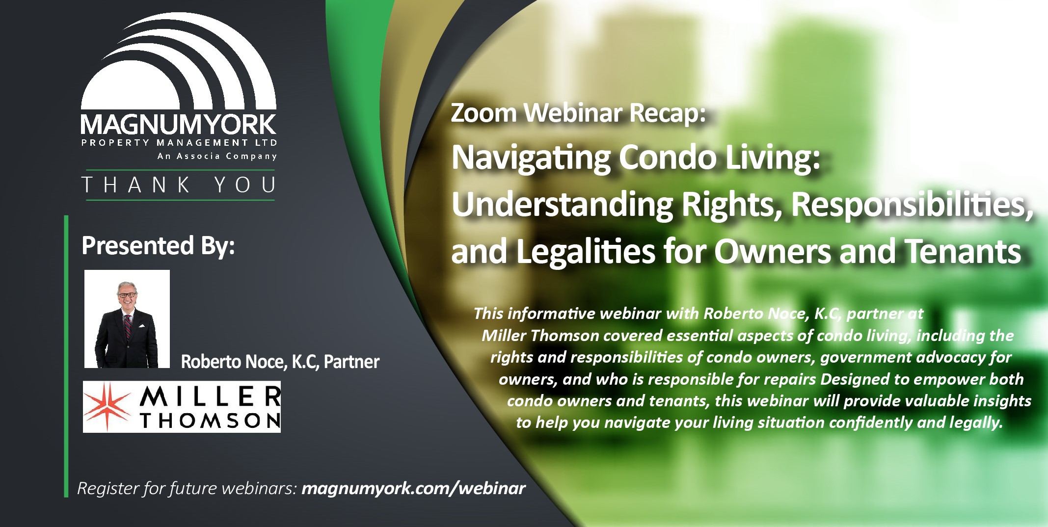 We recently hosted a webinar featuring Roberto Noce, KC, a leading Alberta condominium lawyer and partner at Miller Thomson LLP. This session was packed with practical legal insights for condo owners, tenants, and board members.