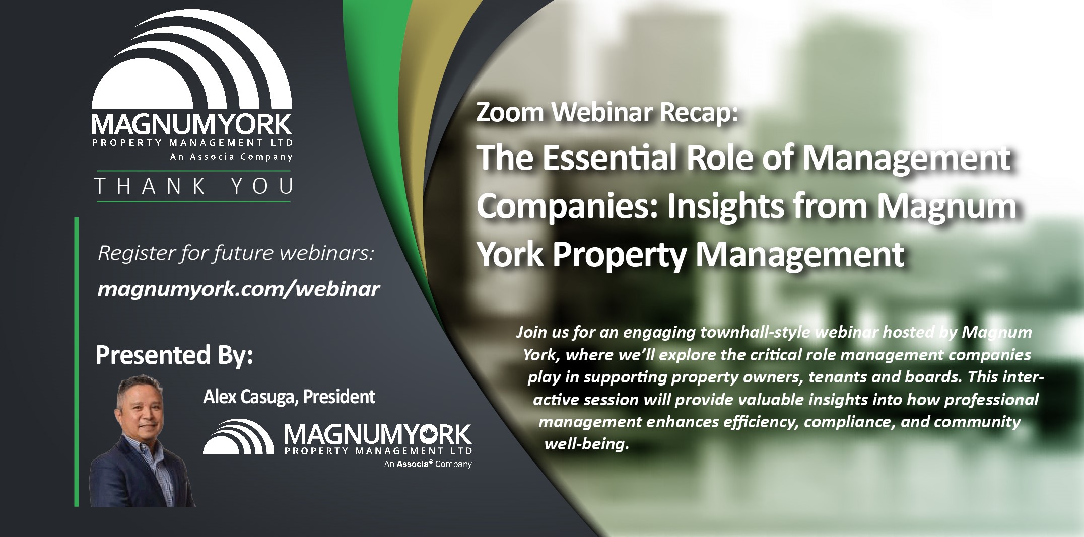 We recently hosted our final webinar of 2025, shining a spotlight on Magnum York Property Management and the critical role management companies play in supporting property owners and boards. Led by Alex Casuga, President of Magnum York and Associate Broker, the session offered a deep dive into the legislative framework, fiduciary responsibilities, and the value of professional property management.